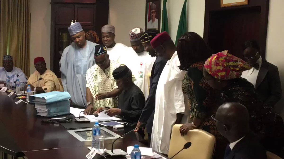 The Acting President, Yemi Osinbajo, on Monday at 4:40pm, signed the 2017 Appropriation Bill into law inside the Presidential Villa, Abuja.